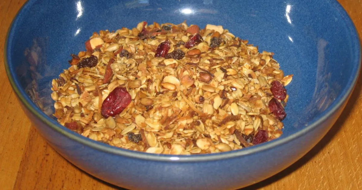 A variation of a delicious granola Pia found in a magazine years ago, which in turn is based on the traditional way granola is made on the island of Nantucket.
